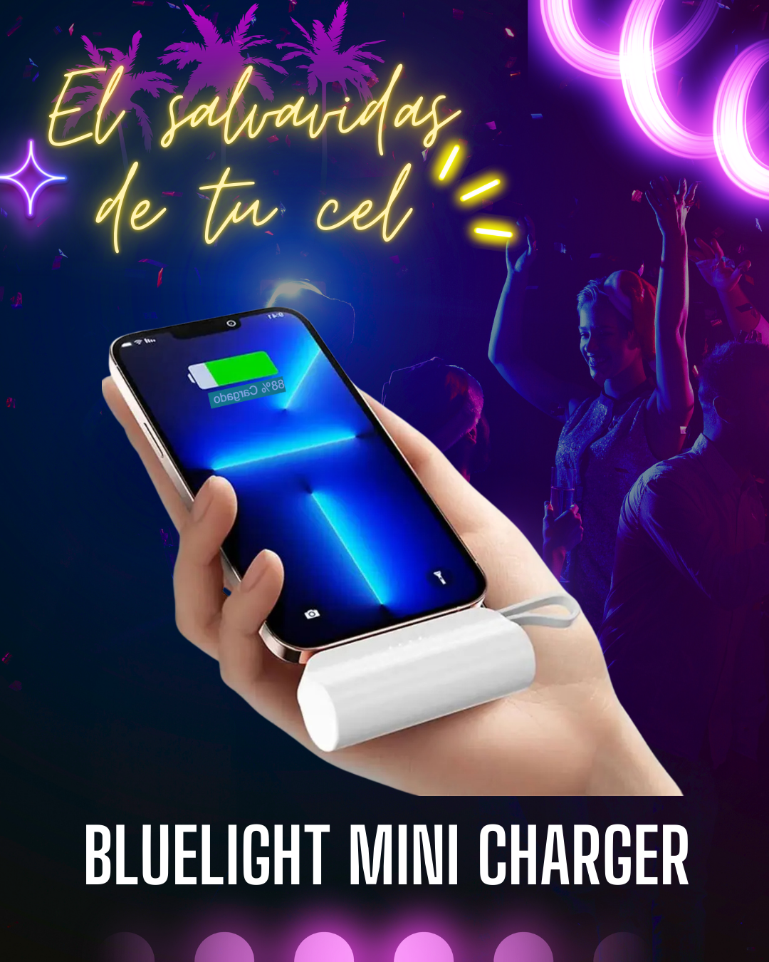 Bluelight Mini Charger es tu solución instantánea cuando la batería está por abandonarte. Sin cables, sin enchufes, solo conéctalo y revive tu celular al instante. Compacto, potente y siempre listo, para que nunca más te preocupes por quedarte incomunicado en el peor momento.