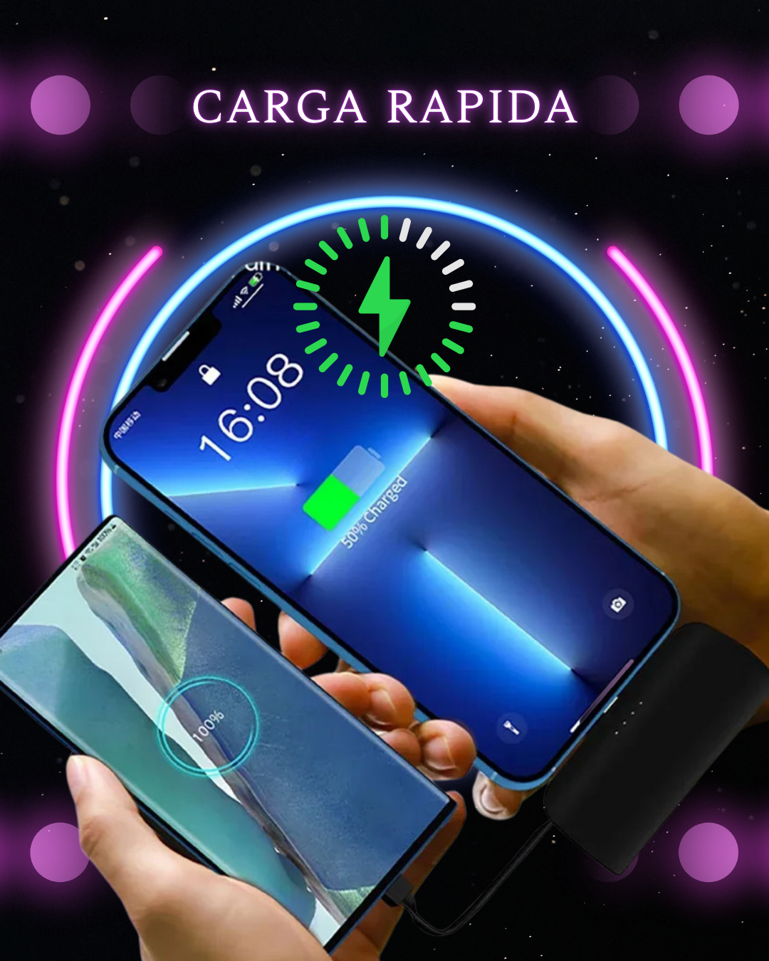 Funciona tanto con Android como con iPhone, además de otros dispositivos USB-C, eliminando la necesidad de múltiples cargadores.